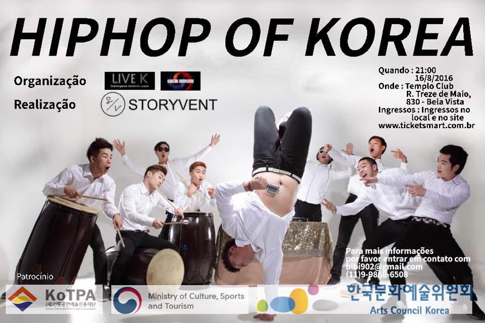 Nessa terça feira, dia 16, acontecerá o HipHop of Korea que vai contar com o show do grupo coreano ‘’Korean Rahpsody”. O grupo já fez shows em 20 países diferentes pela Ásia, Europa e África com apresentações de dança e música, misturando tradição, história e modernidade.