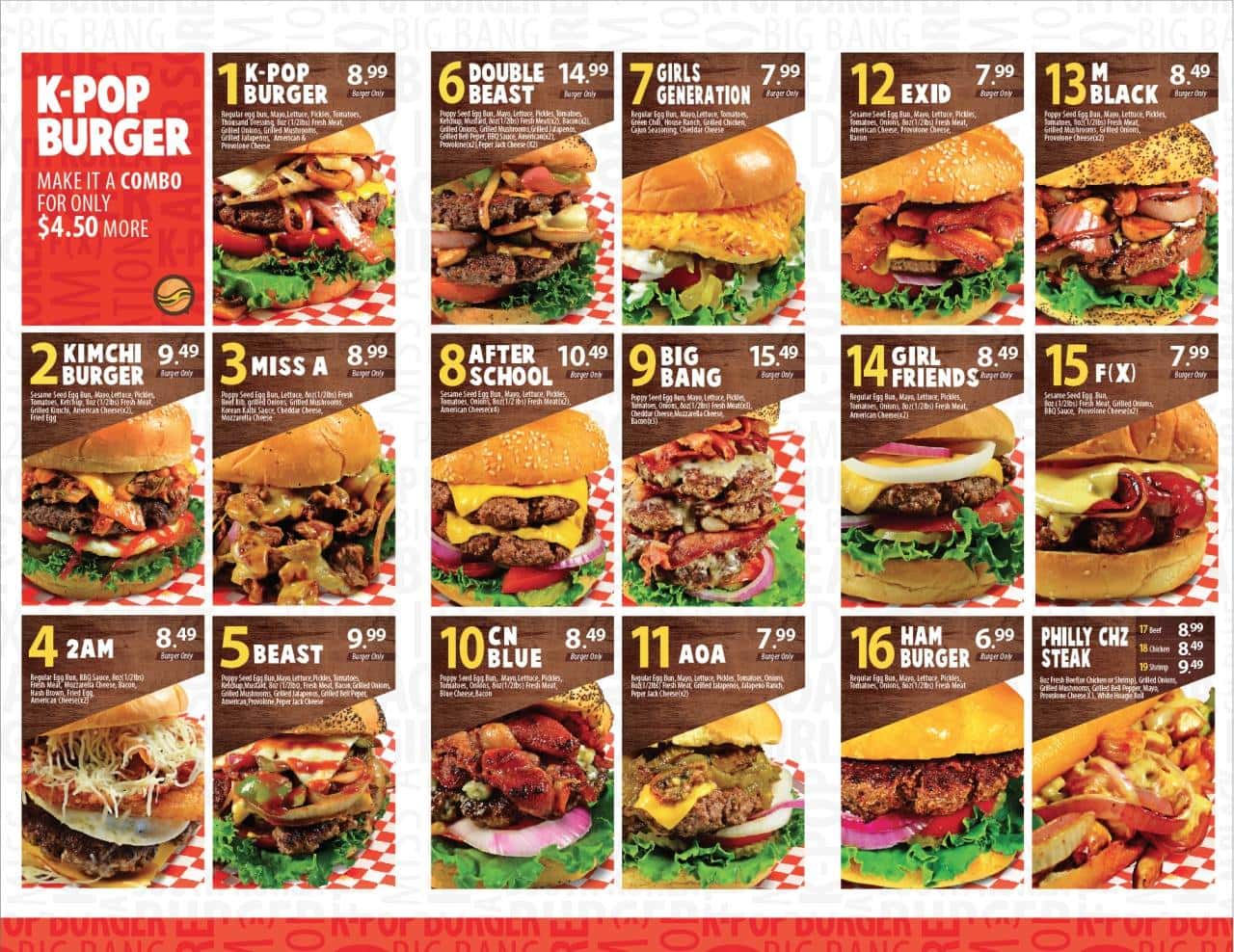 Pode parecer estranho, mas é isso mesmo. Uma hamburgueria no Texas, estado dos EUA, desde 2016 traz um cardápio com sanduíches enormes nomeados com os maiores grupos de Kpop. Se você for visitar a K Pop Burger Fort Worth, poderá pedir por um BigBang (o maior do cardápio), um Girls Generation, talvez um After School pra matar as saudades… Ou fechar a conta com o CN Blue.