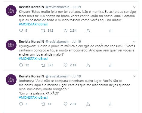 Após apresentações mais fofas como “I Do Love U” e “Sweetheart”, pararam para falar mais um pouco com os fãs. Eles misturaram português ao coreano para expressarem seus sentimentos pelo público brasileiro.