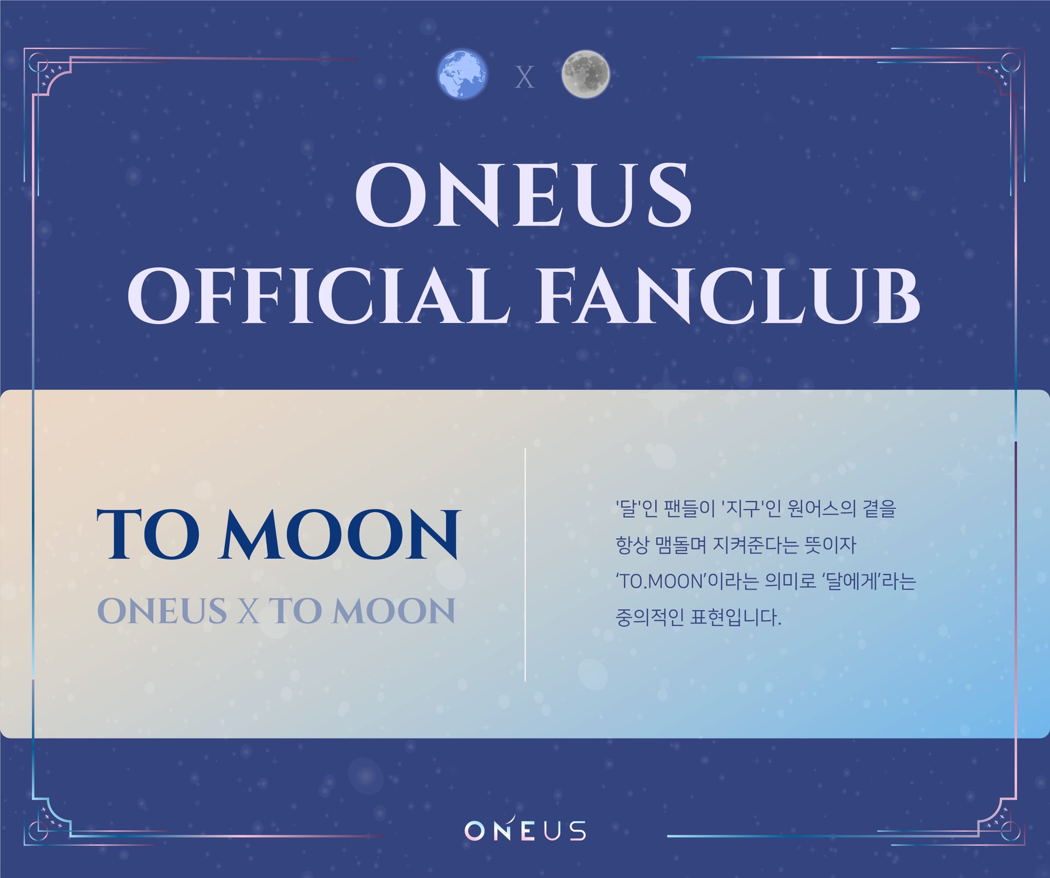 O primeiro da lista veio diretamente da atmosfera. O grupo batizou os fãs como “To Moon” como uma referência a Lua que sempre orbita Oneus, representado pela Terra, mesmo quando eles estão distantes. Durante a live de anúncio, Keonhee confessou que eles já sabiam que seria esse o nome desde a última apresentação: