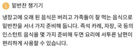 Livre-se da comida velha na geladeira e prepare de 3 a 4 acompanhamentos. Se você preparar comida instantânea, como curry instantâneo, seu marido, que não sabe cozinhar, pode comê-la convenientemente.