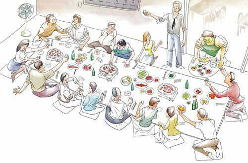 As longas jornadas de trabalho dos sul-coreanos também é bastante conhecida pelo mundo. Funcionários estão sob constante estresse e pressão em seu local de serviço para poder obter um bom desempenho. E, ao terminar o expediente, muitos vão aliviar a tensão comendo, festejando e bebendo.